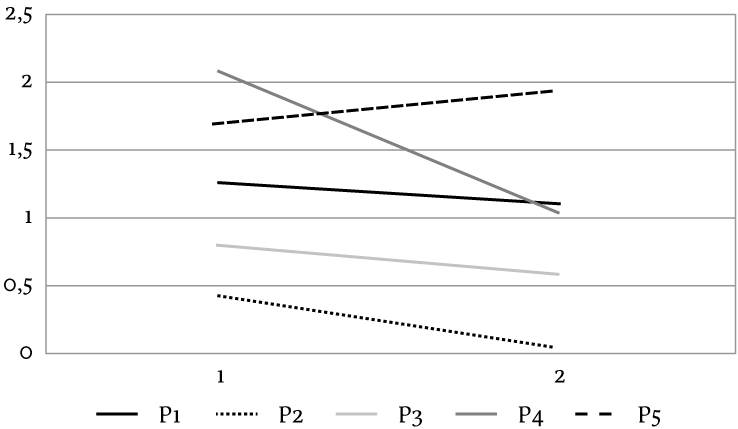 Figuur 2 Totaalscores op de BSI per deelnemer vóór en na behandeling. De y-as geeft de totaalscores op de BSI weer, de x-as de meetmomenten vóór behandeling (1) en na behandeling (2). De patiënten zijn aangegeven met P1, P2, … P5.