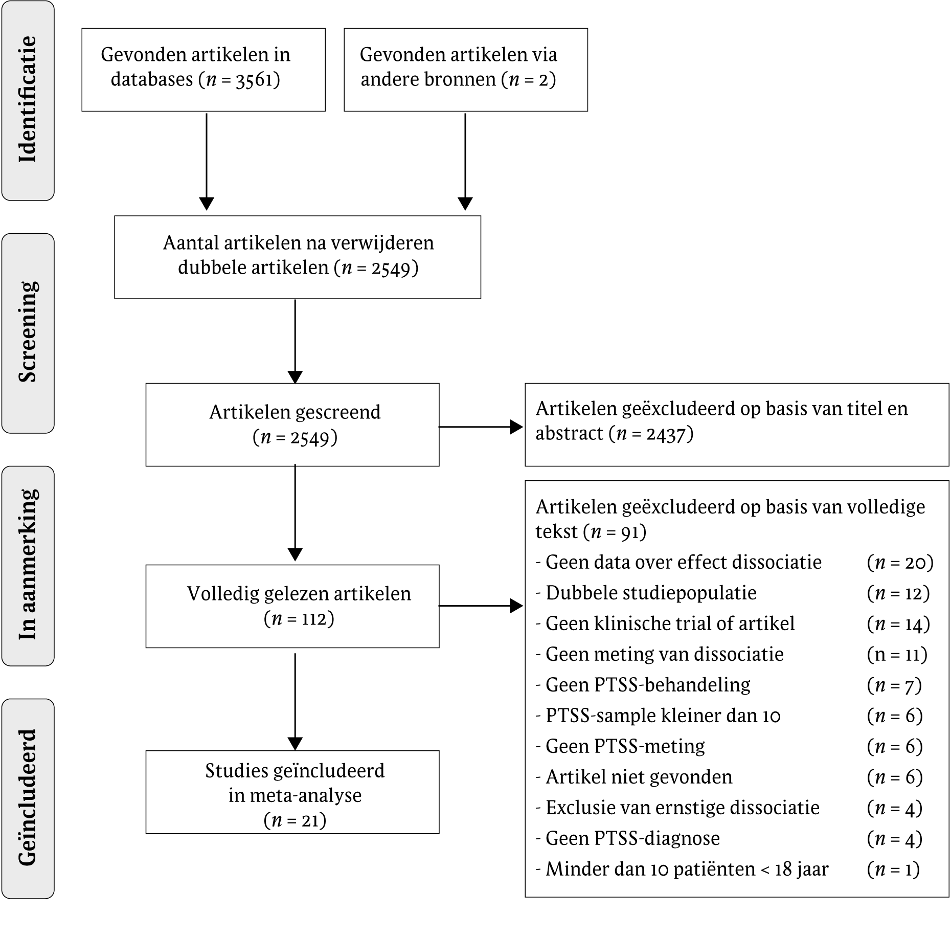 De systematische zoektocht resulteerde in 3563 papers (2549 na het verwijderen van duplicaten). Van deze 2549 papers hebben we 2437 papers geëxcludeerd op basis van titel en abstract, omdat ze niet voldeden aan de inclusiecriteria. We hebben van 112 studies de volledige tekst gelezen. Van deze studies kwamen 9 studies in aanmerking die voldoende data rapporteerden om het effect van dissociatieve symptomen op de behandeluitkomsten te berekenen. In 38 gevallen zochten we contact met de onderzoekers voor extra data, omdat deze studies op basis van de volledige tekst in aanmerking kwamen, maar onvoldoende data rapporteerden om het effect van dissociatieve symptomen op behandeluitkomsten te bepalen. In totaal reageerden 27 van deze onderzoekers. Twaalf onderzoekers konden hun data niet delen (bijvoorbeeld door gebrek aan toegang tot de data, gebrek aan tijd of gebrek aan medewerking). Vijftien onderzoekers hebben wel data gedeeld. Twaalf van deze studies voldeden aan de inclusiecriteria en hebben we geïncludeerd in de meta-analyse. Dit maakt dat bij elkaar 91 van de 112 studies op basis van de volledige tekst zijn geëxcludeerd, omdat ze niet voldeden aan de inclusiecriteria (zie figuur 1 voor details). De overige 21 studies zijn geïncludeerd voor deze meta-analyse. De overeenstemming tussen de twee onafhankelijke beoordelaars in de studieselectie was substantieel (Cohens Kappa = 0,71, SE = 0,03, p < 0,001). De meerderheid van de studies gebruikte de DES als instrument voor dissociatie. De gemiddelde DES-score op voor de start van de behandeling varieerde van 18,4 tot 47,3.