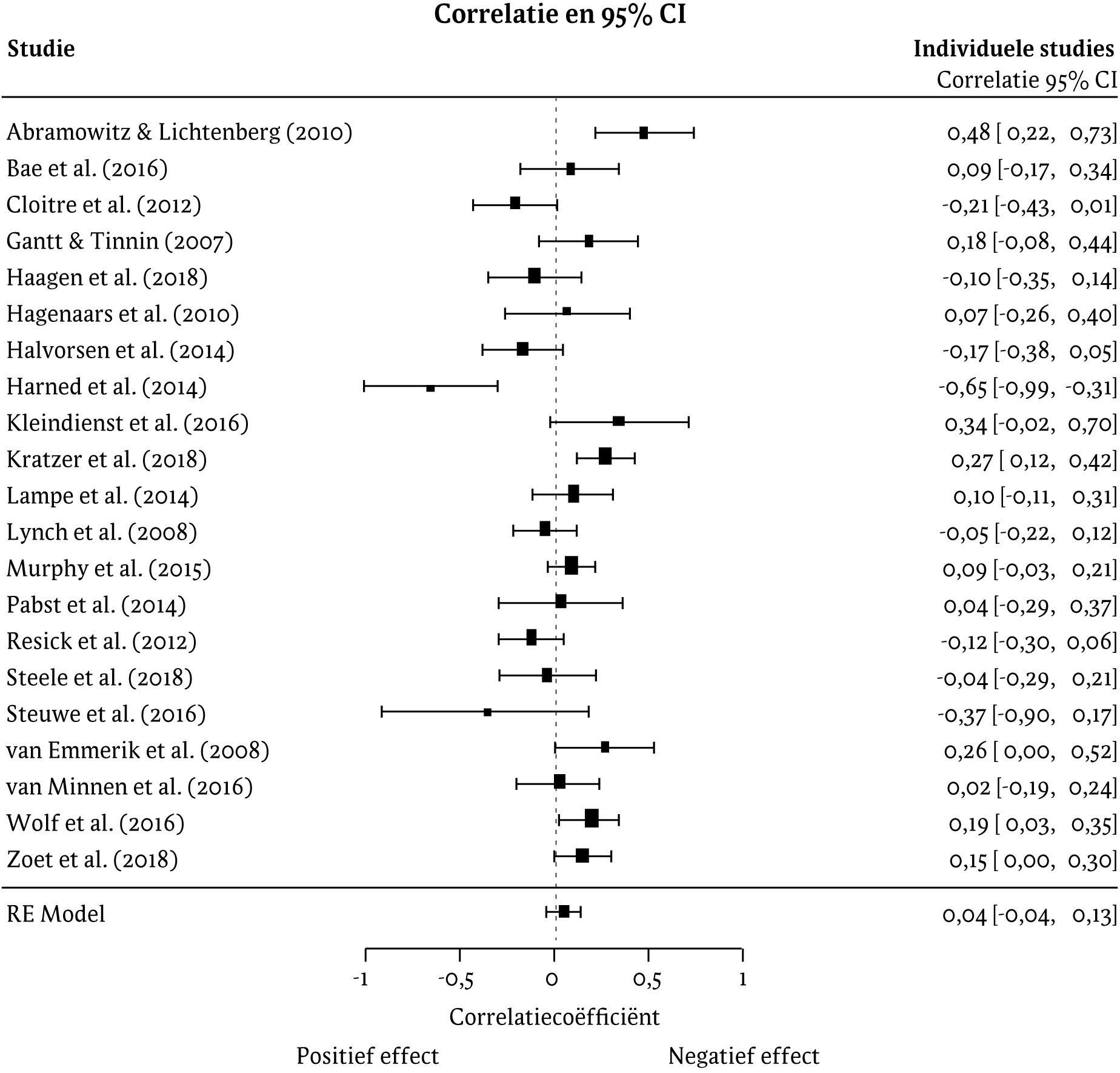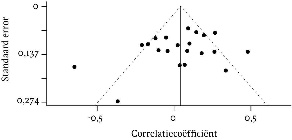 De gepoolde correlatie tussen dissociatieve symptomen voorafgaand aan de behandeling en de verandering in PTSS-symptomen van pre- naar post-behandeling was 0,04 (95% CI: - 0,04; 0,13, p = 0,32; zie figuur 2). De heterogeniteit tussen de studies was relatief hoog: I² = 68,90, p < 0,001. Visuele inspectie van de funnelplot gaf geen indicatie voor asymmetrie (zie figuur 3), wat werd bevestigd door Kendalls tau (p = 0,46) en Eggers' test (p = 0,25). Op vier studies na omvat het betrouwbaarheidsinterval de nul. De funnelplot toont echter dat twee van deze vier studies potentiële uitschieters zijn: de resultaten van Harned en collega's (2014), die een positief effect vonden van dissociatieve symptomen, en de studie van Abramowitz en Lichtenberg (2010), die een negatief effect vonden van dissociatieve symptomen. De steekproefgrootte van de studie van Harned en collega's (2014) was klein (n = 12) en er was veel uitval uit deze studie. De studie van Abramowitz en Lichtenberg (2010) was een open studie met een relatief kleine steekproef (n = 36). De betrouwbaarheid van het effect van beide studies is daardoor twijfelachtig.