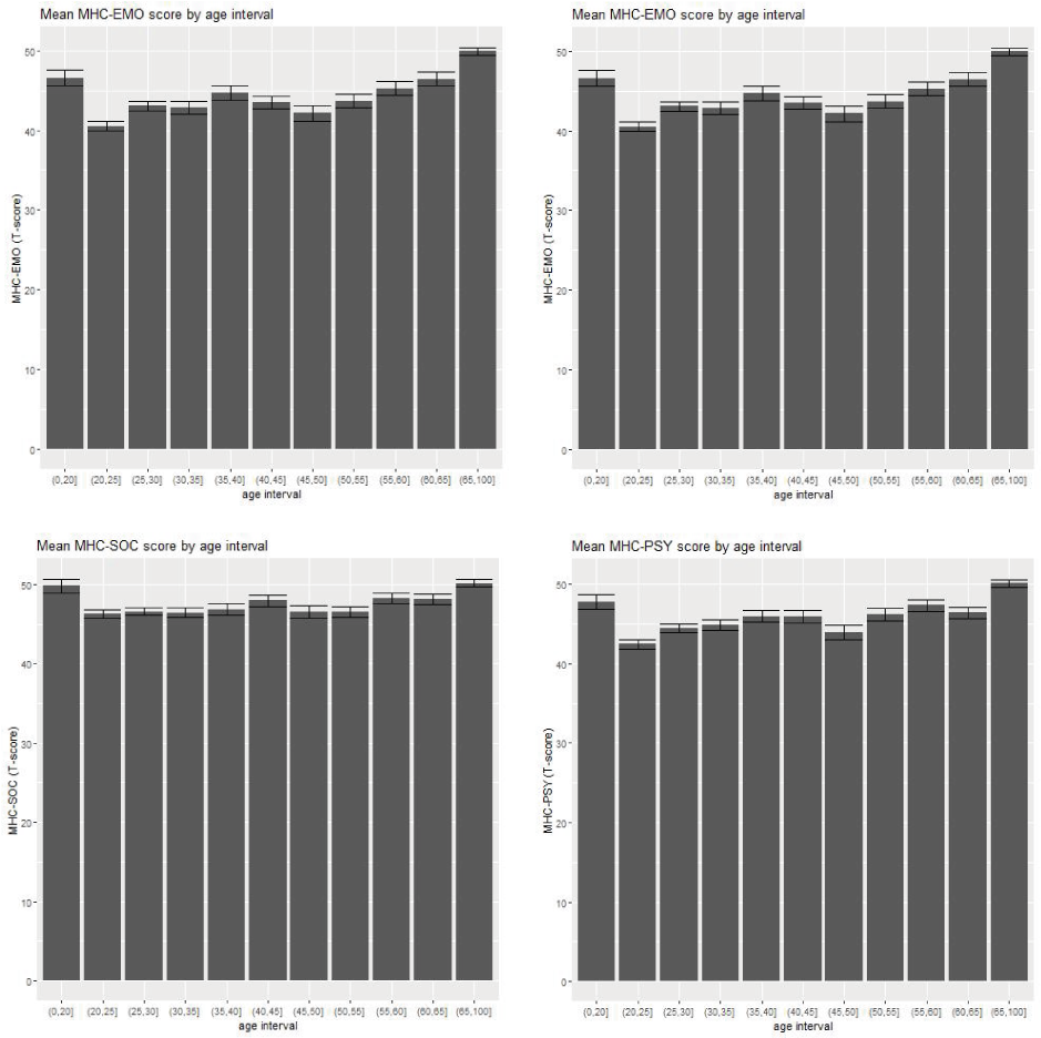 Figuur A Scores van 11 leeftijdsgroepen van telkens 5 jaar op de vier schalen van de MHC-SF. Welbevinden loopt geleidelijk op met de leeftijd, met uitzondering van de jongste groep (0-20), bij wie het welbevinden nagenoeg gelijk is aan de oudste groep (65 en ouder). MHC_EMO = Emotioneel Welbevinden; MHC_PSY = Psychologisch Welbevinden; MHC_SOC = Sociaal Welbevinden.