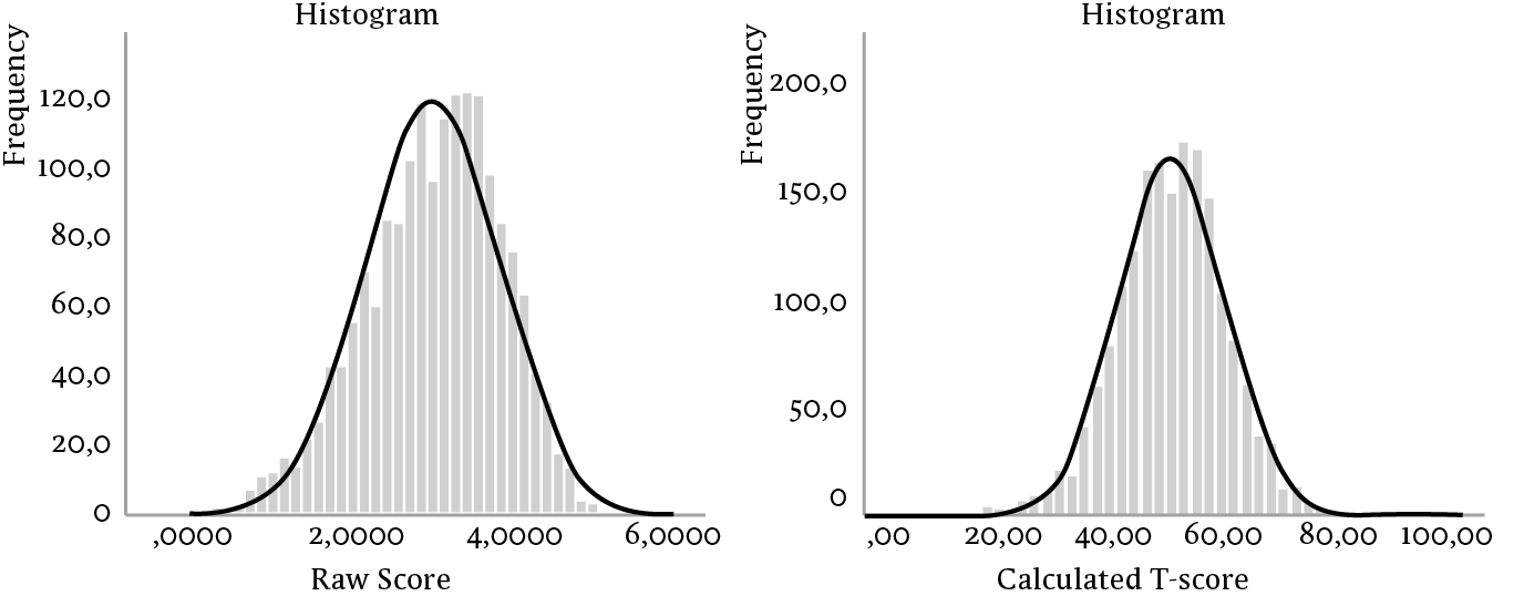 Figuur B Frequentieverdeling van ruwe scores (links) en berekende T-scores (rechts) voor de MHC-SF-totaalschaal voor positieve geestelijke gezondheid. De doorgetrokken lijn geeft de normaalverdeling weer. De ruwe scores zijn enigszins links scheef (hoge scores zijn oververtegenwoordigd), terwijl de berekende T-scores normaal zijn verdeeld.