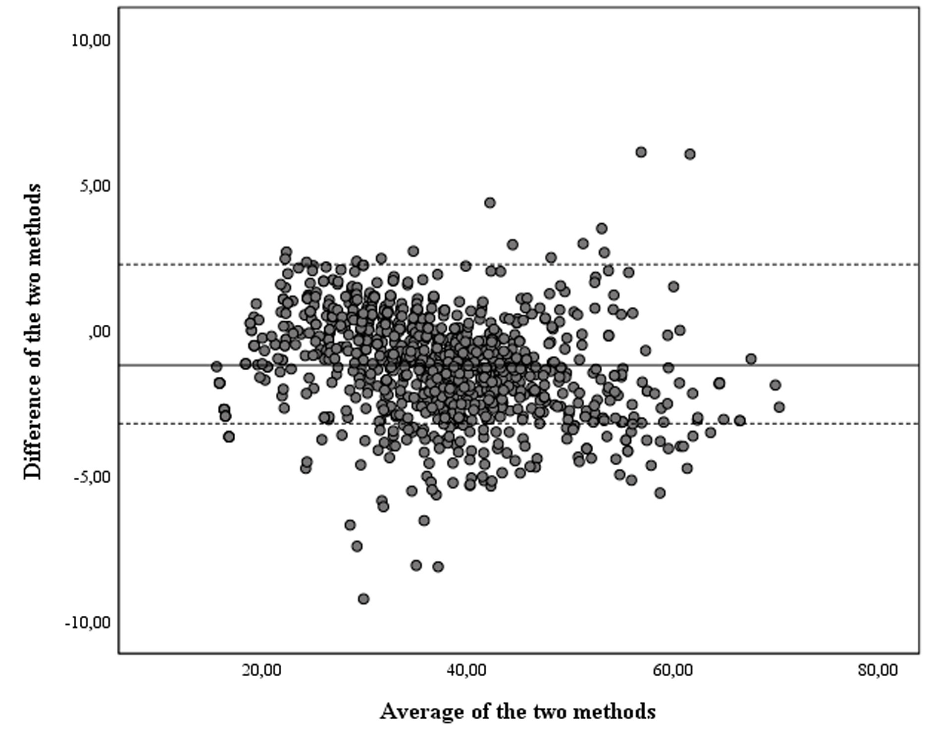 Figuur C Bland-Altman-grafiek voor psychologisch welbevinden, waarin IRT-gebaseerde scores en berekende T-scores zijn vergeleken. Het verschil tussen op theta gebaseerde T-scores en T-scores berekend volgens een formule is slechts zeer incidenteel groter dan 5 punten; voor 95% van de vergeleken scores is het verschil kleiner dan 2,5 T-punt; verschillen zijn gelijkmatig verspreid over de schaal, weergegeven op de x-as.