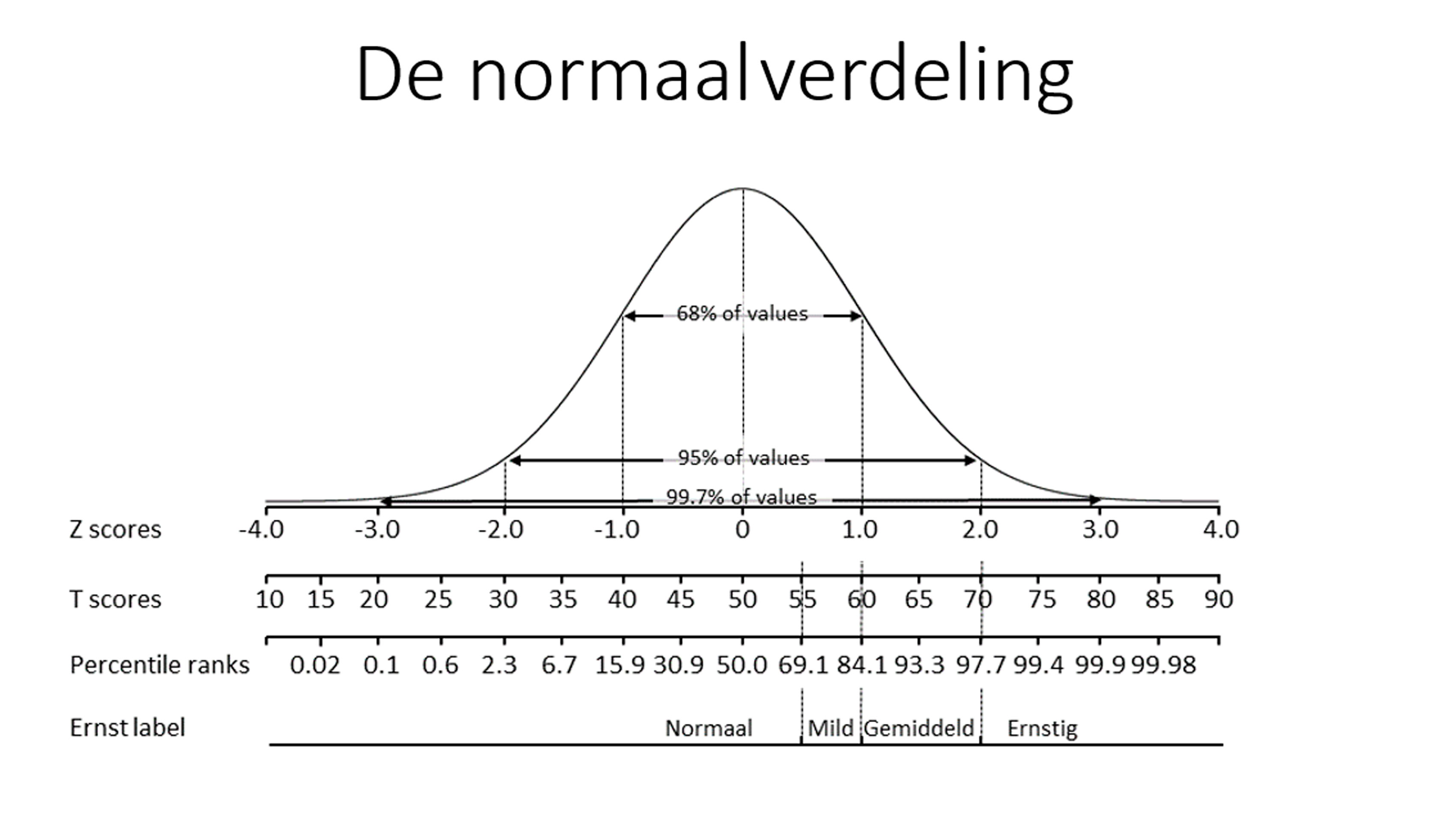 Figuur D De normaalverdeling met Z-scores, T-scores, percentielscores en hun betekenis. T-scores zijn Z-scores of standaardscores met een gemiddelde van M = 50 en een standaarddeviatie van 10. Z = 0 komt overeen met T = 50, Z = 1 komt overeen met T = 60, enzovoort. T-scores zijn via de cumulatieve normaalverdeling om te zetten naar percentielscores. In figuur D is te zien dat bij normaal verdeelde T-scores 68% van de populatie een score heeft in de 40-60 range, 95% in de 30-70 range en 99,7% in de 20-80 range. Voor de betekenis van T-scores in woorden heeft PROMIS grenswaarden voorgesteld zoals hierboven weergegeven (tot 55 is normaal, 60 is de overgang van mild naar gemiddeld, en vanaf 70 is ernstig).