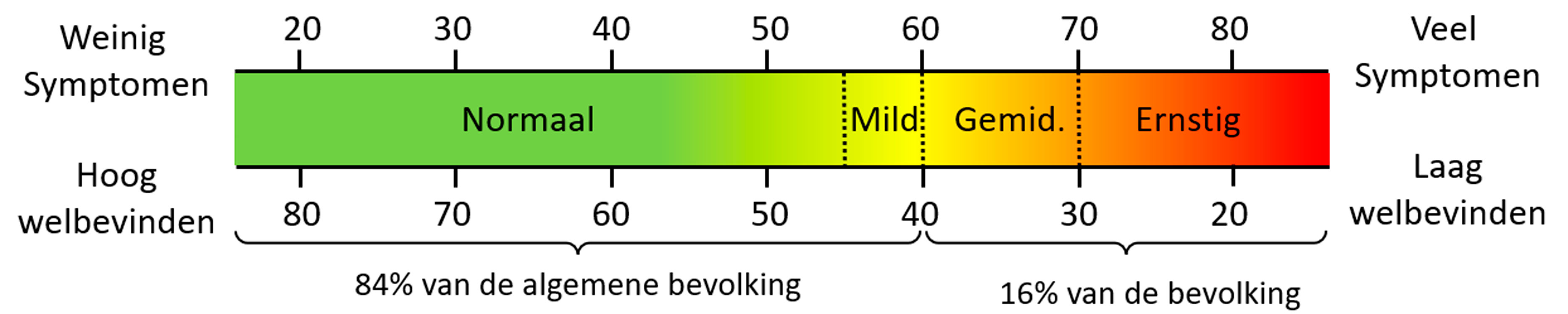 Figuur E De betekenis van de T-score: de T-score is hoger naarmate het gemeten construct sterker aanwezig is. Bij meetinstrumenten van klachten of symptomen (depressie, angst, pijn) betekent een hogere score meer klachten; bij functioneren, welbevinden of kwaliteit van leven betekent een hogere score beter functioneren, meer welbevinden of een betere kwaliteit van leven.