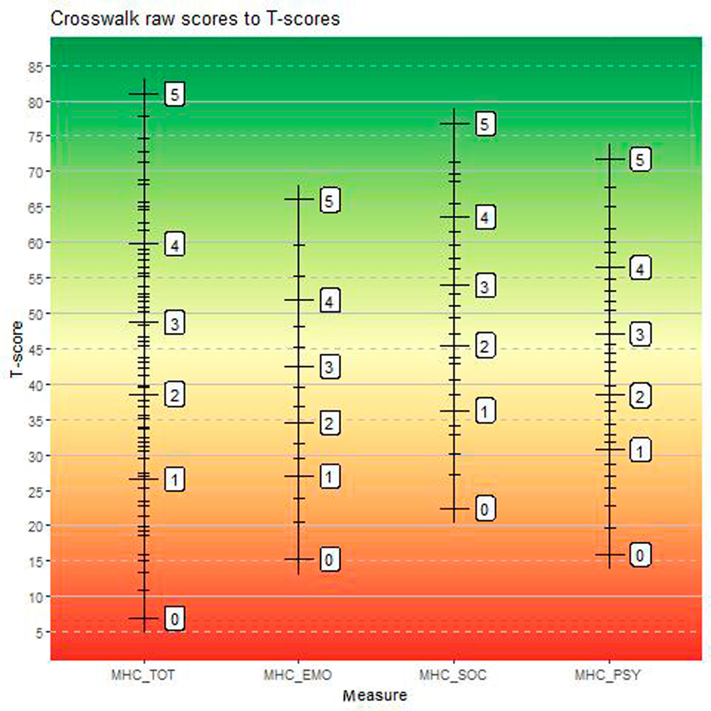 Figuur F Oversteekfiguur met alle mogelijke ruwe scores op de vier schalen van de MHC-SF en hun positie ten opzichte van T-scores. MHC_EMO = Emotioneel Welbevinden; MHC_PSY = Psychologisch Welbevinden; MHC_SOC = Sociaal Welbevinden; MHC_TOT = positieve geestelijke gezondheid.