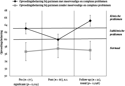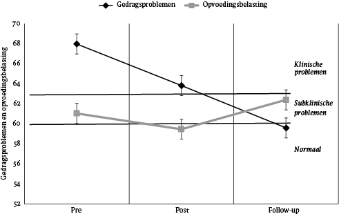 Over de totale onderzoeksgroep bezien, blijkt de mate van opvoedingsbelasting bij aanvang niet van invloed te zijn op de mate van verandering in gedragsproblemen bij de nameting, maar wel in negatieve zin bij de follow-up. Ook hier zou sprake kunnen zijn van beperkt betrouwbare wijze waarop de opvoedingsbelasting is gemeten. Vervolgonderzoek met gebruikmaking van bijvoorbeeld meerdere respondenten en meetinstrumenten zou hier meer zicht op kunnen geven. Een reële suggestie is ook dat een factor als opvoedingsvaardigheden een betere voorspeller is voor een verandering in gedragsproblemen, juist ook omdat de interventie in deze studie beoogt daarop aan te grijpen.