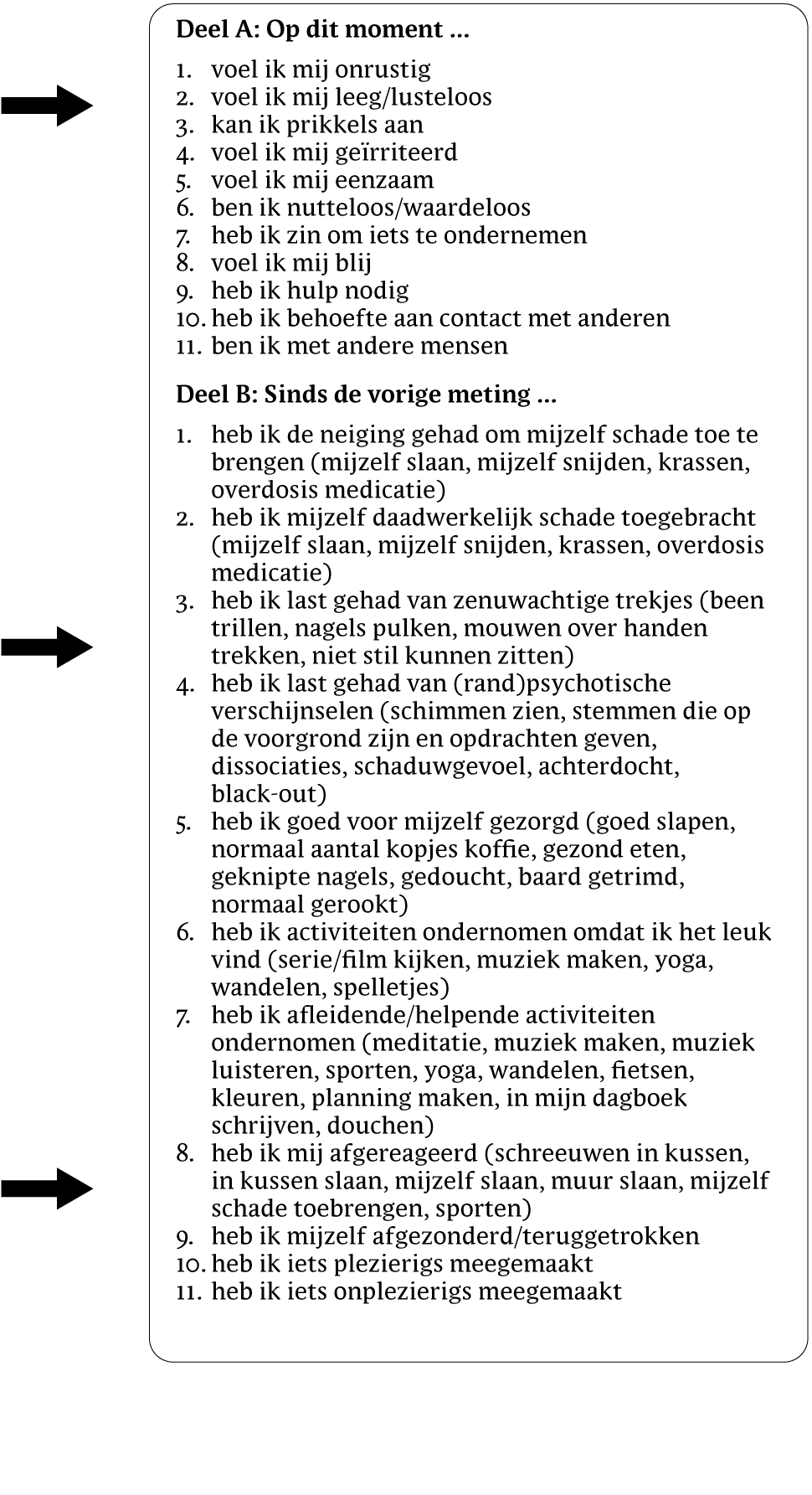 Bij het opstellen van de gepersonaliseerde vragenlijst is ervoor gekozen om het cognitief-gedragstherapeutische model als uitgangspunt te nemen (gebeurtenis, gedachten, gevoel en gedrag) en de vragen onder te verdelen in twee delen: (1) deel A ('Op dit moment …') dient om zicht te krijgen op de gevoelens en gedachten die op het moment van invullen een rol speelden; (2) deel B ('Sinds de vorige meting …') biedt zicht op gedragingen in de afgelopen uren die invloed kunnen hebben gehad op de ingevulde huidige gevoelens en gedachten. Verder is een aantal vragen toegevoegd gericht op context (bijvoorbeeld locatie en gezelschap). De thema's die centraal stonden in het door de participant opgestelde CSP werden geherformuleerd, leidend tot een vragenlijst. Tevens was er ruimte om nieuwe thema's toe te voegen aan de vragenlijst. Op deze manier werd voor iedere participant een gepersonaliseerde vragenlijst gecreëerd met relevante vragen over de crisogene factoren, teneinde zo (vroege) signalen te monitoren.