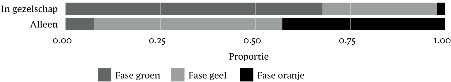 Figuur 3 Gezelschap per fase. De grijstinten corresponderen met de fase in het cisissignaleringsplan (groen, geel, oranje; zie box 2, figuur 1). De proportie geeft weer hoe vaak de participant heeft aangegeven in de desbetreffende fase te zitten.