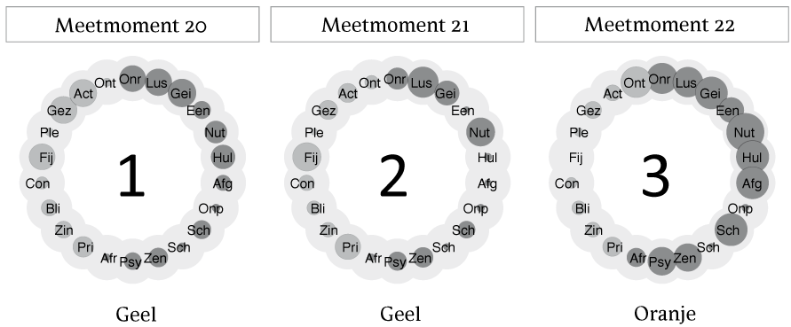 In de figuren 5, 6 en 7 is een aantal op elkaar volgende meetresultaten weergegeven uit de periode die geselecteerd is in stap 2. De cirkelfiguren geven een overzicht van de mate waarin de participant een item heeft beoordeeld als aan- of afwezig, waarbij één cirkel staat voor één meetmoment. Door de (op elkaar volgende) meetmomenten met elkaar te vergelijken, kunnen veranderingen in gedachten, gevoelens en gedrag worden gevonden, en kan gezocht worden naar patronen. Te zien is dat de spanning bij participant 1 toeneemt: hij beoordeelt zijn spanningsniveau eerst als geel (figuren 5 en 6) en later als oranje (figuur 7). Kijkend naar de items valt op dat gevoelens van onrust, lusteloosheid, nutteloosheid en irritatie toenemen bij oplopende spanning. In gedrag wordt gezien dat hij last krijgt van zenuwachtige trekjes, (rand)psychotische verschijnselen en slecht slapen.