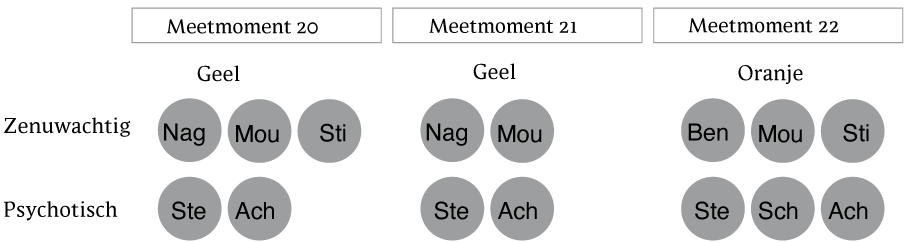 Figuur 8 De symptomen in detail. 'Zenuwachtig' correspondeert met vraag B3 (zie box 2, figuur 2), 'Psychotisch' met vraag B4. 'Ach' = achterdocht, 'Mou' = mouwen over handen trekken, 'Nag' = nagelbijten, 'Sch' = schimmen zien, 'Ste' = stemmen die op de voorgrond zijn en opdrachten geven, 'Sti' = niet stil kunnen zitten. Boven de figuur staat de fase waarin de participant aangaf te zitten tijdens het invullen van de vragenlijst op het desbetreffende meetmoment.