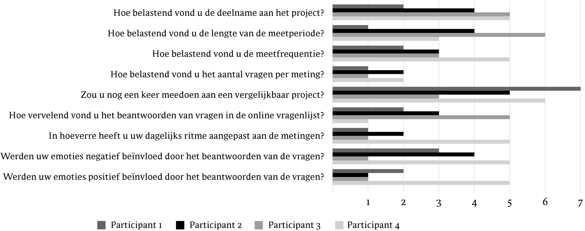 Figuur 9 Resultaten evaluatieformulier na deelname. Op de y-as de gestelde vragen in het evaluatieformulier. Op de x-as een zevenpunts-likertschaal met 1 = Niet belastend/Zeker niet meedoen/Helemaal niet vervelend/Helemaal niet aangepast/Helemaal niet beïnvloed; 7 = Heel erg belastend/Zeker meedoen/Heel erg vervelend/Heel erg aangepast/Heel erg beïnvloed.