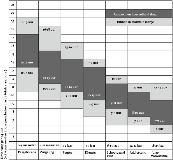 Figuur 1 Aanbevolen slaapduur per leeftijdsfase, gebaseerd op de richtlijnen van de National Sleep Foundation (Hirshkowitz et al., 2015)