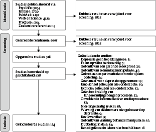 Studies werden verzameld via de elektronische databases PsycINFO, Embase, ISI Web of Science en PubMed tot en met augustus 2021. Om zoveel mogelijk relevante studies te vinden, werd de volgende Engelstalige zoekopdracht in de databases ingevoerd: (depress* OR dysphor* OR dysthym* OR 'mood disorder*' OR 'affective disorder') AND (encod* OR memor* OR remember* OR mnemonic* OR recall OR recog* OR recollect* OR schema* OR retriev*) AND (self-referent* OR mood-congruen* OR bias* OR autobiograph*). Daarnaast werden dezelfde zoektermen gebruikt om ongepubliceerde studies te vinden in ProQuest Dissertations en Theses. Ten slotte zochten we handmatig binnen de referentielijsten van relevante artikelen, om er zeker van te zijn dat zoveel mogelijk relevante studies in aanmerking kwamen voor inclusie. Voor een gedetailleerde beschrijving van de criteria waar een studie aan moest voldoen, verwijzen wij u graag naar het Engelstalige artikel over dit onderzoek (Everaert et al., 2022).