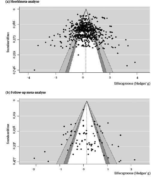 Ten tweede werden de effectgroottes in gepubliceerde versus ongepubliceerde studies vergeleken door middel van moderatoranalyse. De resultaten toonden aan dat het effect van publicatiestatus significant was (F(1, 684) = 4,57, p = 0,033). In gepubliceerde onderzoeken werden sterkere effectgroottes gerapporteerd dan in niet-gepubliceerde onderzoeken (geschat verschil: g = 0,19, 95% CI [0,06, 0,33], p = 0,009). Dit suggereert dat studies met nul- of negatieve bevindingen minder kans hadden gepubliceerd te worden. Ten slotte bleek uit inspectie van de trechterplot (zie figuur 3) dat er geen small-study-effecten waren. Dit wijst erop dat de effecten van kleinere studies niet systematisch verschilden van die van grotere studies.