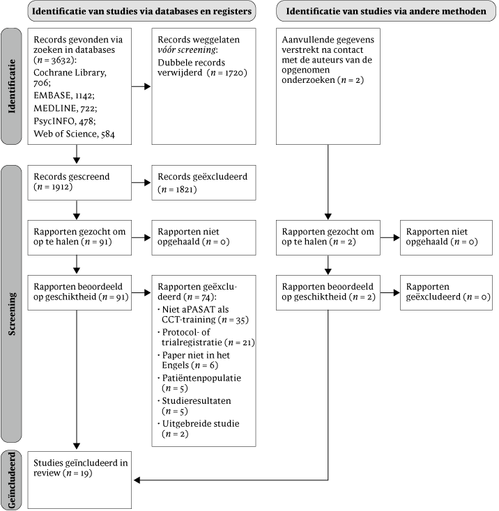 De zoektocht naar studies werd eerst uitgevoerd op 29 maart 2021 en herhaald op 28 september 2021. Er werd gezocht in de volgende elektronische databases: PsycINFO, MEDLINE, Embase, Cochrane Library en Web of Science, waarbij de volgende kernwoorden werden gebruikt om te zoeken op titel en abstract: ('cognitive control therapy' OF 'CCT' OF 'cognitive control training' OF 'cognitive control task' OF 'neurocognitive training' OF 'cognitive training' OF 'executive control training' OF 'working memory training' OF 'cognitive emotional training' OF 'cognitive remediation' OF 'neurobehavioral therapy' OF 'PASAT' OF 'Paced Auditory Serial Addition Task') EN (depress* OF 'negative repetitive thinking' OF 'repetitive negative thinking' OF ruminat* OF 'negative mood' OF 'brooding'). Om de impact van publicatiebias te verminderen, kwamen ook doctoraatsthesissen in aanmerking die aPASAT-training gebruikten en die de impact op depressieve klachten of ruminatie evalueerden.