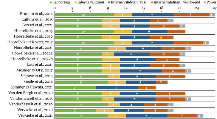 De Downs and Black checklist (Downs & Black, 1998), een methode om het risico op bias en om de interne en externe validiteit na te gaan, werd in deze studie door twee beoordelaars onafhankelijk van elkaar gebruikt om de kwaliteit van de geïncludeerde studies te beoordelen. Wanneer de twee reviewers verschilden van mening over het risico op bias, werd een derde reviewer als arbiter aangesteld, zoals aanbevolen door de Agency for Healthcare Research and Quality (Viswanathan et al., 2018).