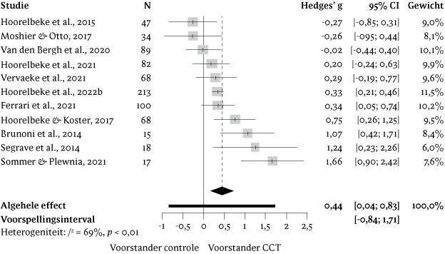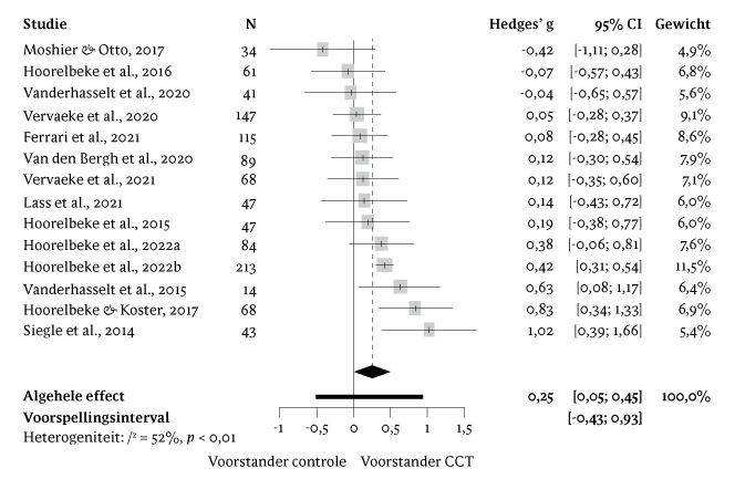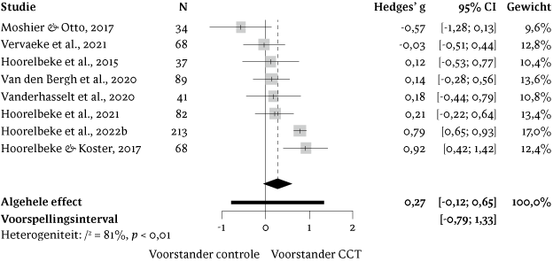 De analyses werden uitgevoerd in R (versie 4.0.5; R Core Team, 2021). Voor elk van de geselecteerde studies werden Hedges' g effectgrootten berekend voor depressieve symptomatologie en ruminatie. Hedges' g werd verkozen boven Cohens d, omdat deze een correctie biedt voor positieve bias in kleine steekproeven. De effectgrootten werden geïnterpreteerd volgens de aanbevelingen van Cohen (dat wil zeggen: we hanteerden 0,2 als 'klein', 0,5 als 'gemiddeld' en 0,8 als cut off voor 'grote' effecten; Cohen, 1988). Bij studies met meerdere condities werd de CCT-groep vergeleken met de meest vergelijkbare controlegroep.