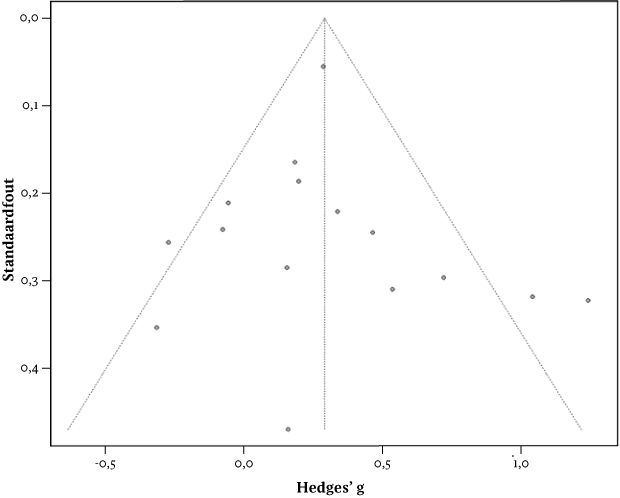 Aanwijzingen voor publicatiebias werden onderzocht met behulp van visuele inspectie van de funnel plot, Eggers test en de Duval en Tweedie's trim-and-fill-methode, uitgevoerd op de primaire uitkomstmaat bij de postmeting. De funnel plot vertoonde geen asymmetrie of indicatie van publicatiebias (figuur 7). Eggers test was niet significant (p = 0,850). Duval en Tweedie's trim-and-fill-procedure verwijderde geen studies en voegde er ook geen toe, waardoor de gepoolde effectgrootte niet veranderde. Er werden geen aanwijzingen voor publicatiebias gevonden, wat wijst op een succesvolle en volledige zoekstrategie.