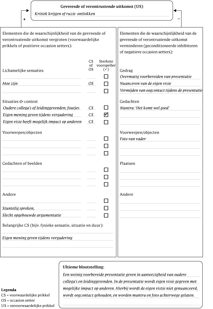 Verdere analyse (zie OptEx Nexus in figuur 1) maakt duidelijk dat Paul allerlei veiligheidsgedrag toepast, waaronder het overmatig voorbereiden van een beleidspresentatie, het voortdurend nuanceren van zijn stelling, het vermijden van oogcontact tijdens de presentatie, het intern herhalen van een soort geruststellende mantra ('Het komt wel goed') en het bij zich dragen van een foto van zijn vader (die een krachtige figuur was). Pauls angst is meer uitgesproken wanneer hij zich moe voelt. Dit is een occassion setter, want op zich leidt vermoeidheid niet tot angst, maar subjectief verhoogt het de kans dat dingen zullen mislopen tijdens de presentatie. De kans op kritiek en conflicten schat Paul het hoogste in als hij zijn mening moet uitdrukken (CS), wanneer een eigen voorstel mogelijk impact heeft op anderen (zoals een voorstel voor taakherverdeling) (CS), wanneer hij kleine foutjes maakt tijdens de presentatie (zoals stotteren of foute zinsconstructies) (CS) en wanneer in het publiek oudere collega's of leidinggevenden aanwezig zijn (CS). De OptEx Nexus (figuur 1) toont onderaan de ultieme exposure voor Paul. Deze opdracht geeft het meeste kans op leren, omdat de verwachting van de US (kritiek en/of conflicten krijgen) het grootste is. Dit wordt bereikt door cruciale CS'en te combineren en geconditioneerde inhibitoren achterwege te laten.