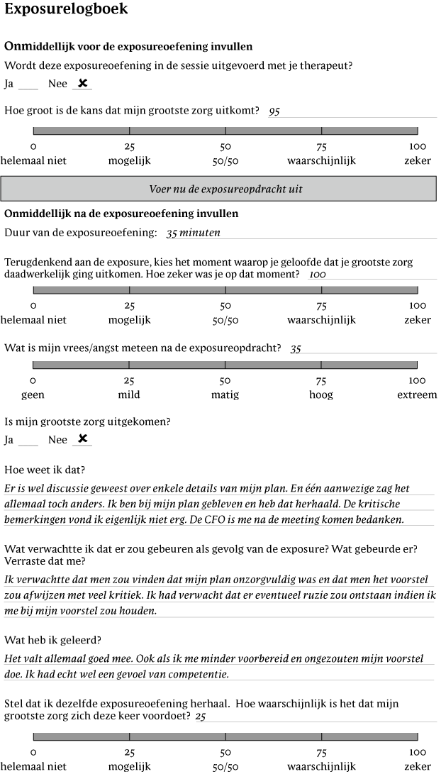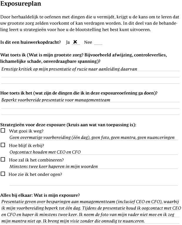 Enkele weken later moest Paul als onderdeel van een globale besparingsoperatie binnen zijn bedrijf een presentatie geven voor het managementteam. Dit werd aangegrepen als ultieme test voor zijn verwachting. De 'ultieme exposure' uit de OptEX Nexus werd gepland, waarin alle cruciale elementen uit de exposureopdracht waren verwerkt. Niet alleen zou Paul een persoonlijk plan moeten voorleggen voor besparingen in zijn afdeling, het zou zeker kritisch beluisterd worden door de aanwezige senior managers en de CEO. Om deze unieke situatie om te bouwen tot een ijzersterke toets van Pauls angstige verwachtingen, zouden ook alle veiligheidsgedragingen achterwege moeten blijven ('Wat gooi ik weg?'). Daarom werd op voorhand afgesproken wat een aanvaardbare voorbereidingstijd zou zijn (niet 'overmatig voorbereiden') en werd gepland om zijn visie ongenuanceerd te presenteren. Zijn interne mantra en de foto van zijn vader zouden achterwege blijven. Tijdens de presentatie zou Paul oogcontact houden met de belangrijkste aanwezigen ('Hoe blijf ik erbij?'). De figuren 2 en 3 tonen het exposureplan en het exposurelogboek voor deze oefening. Paul schatte de kans op ernstige kritiek of conflicten vooraf in op 95%. Na de vergadering liet hij zijn therapeut via e-mail weten dat alles goed gelopen was.