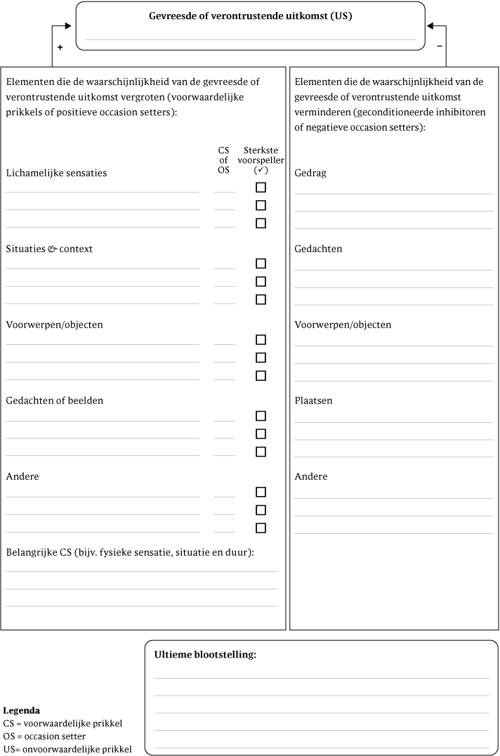 - 1.Bijlage bij Vervliet, B., Hermans, D., Treanor, M., Zbozinek, T., & Craske, M. G. (2024). Optimaliseren van exposuretherapie met een inhibitory-retrieval-aanpak en de OptEx Nexus. Gedragstherapie, 57, 15-59. Dit materiaal verscheen oorspronkelijk in Behaviour Research and Therapy: Craske, M. G., Treanor, M., Zbozinek, T. D., & Vervliet, B. (2022). Optimizing exposure therapy with an inhibitory retrieval approach and the OptEx Nexus. Behaviour Research and Therapy, 152, 104069. https://doi.org/10.1016/j.brat.2022.104069. Opgenomen met toestemming van Elsevier.