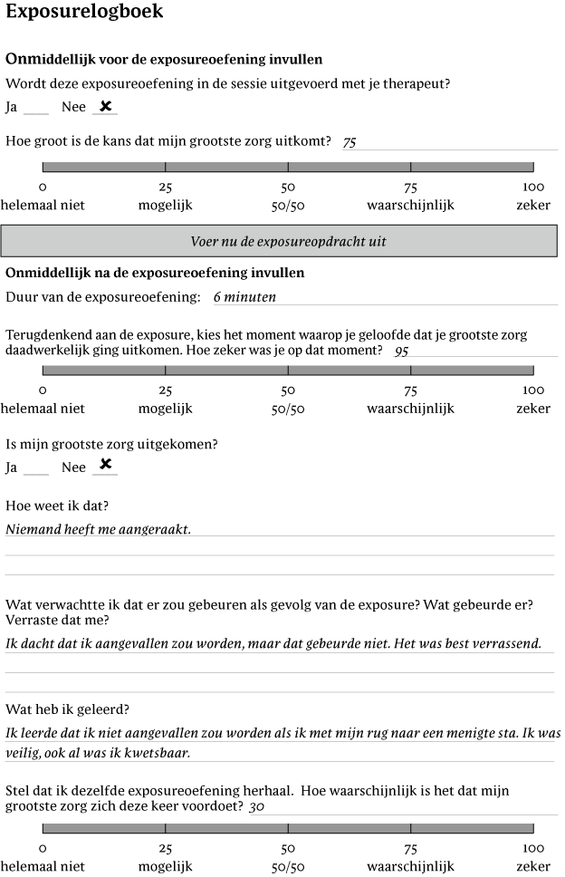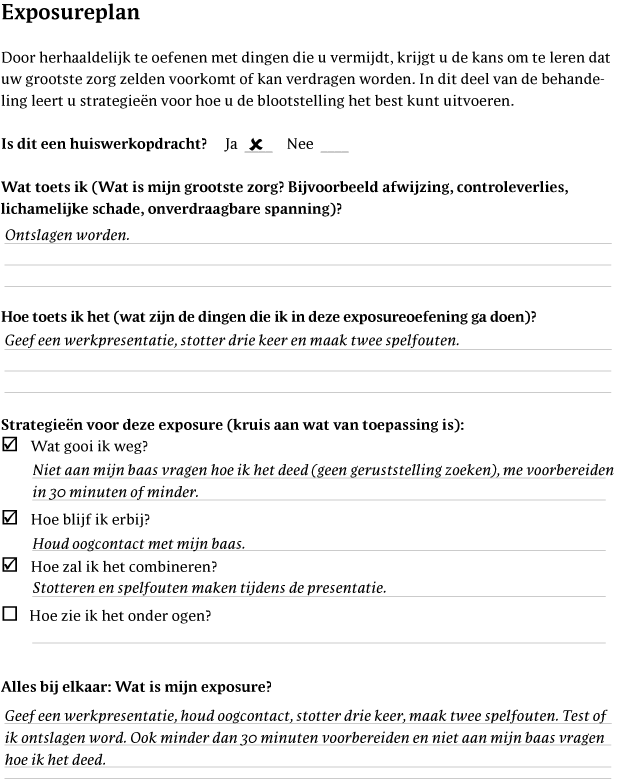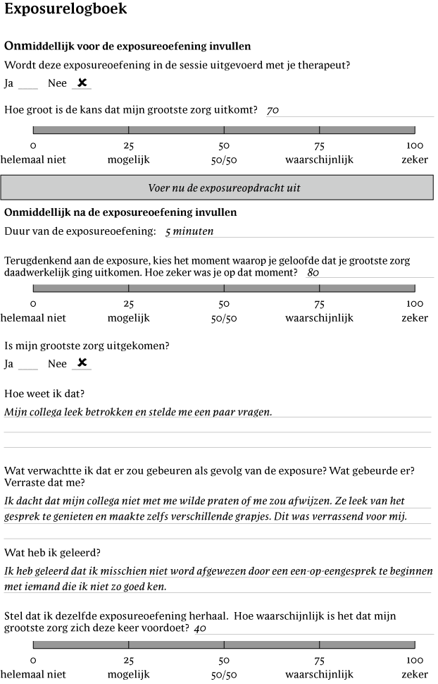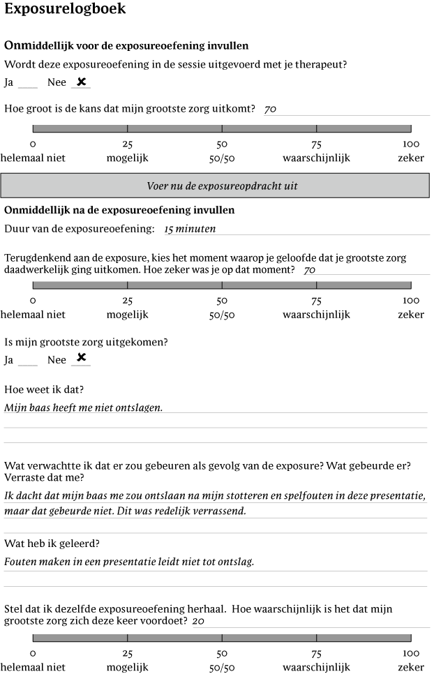 Daaropvolgende exposures mondden erop uit dat Jessica verbale presentaties gaf terwijl ze kleine foutjes maakte (bijvoorbeeld stotteren, het verkeerde woord zeggen) en het zoeken naar geruststelling achterwege liet. Tijdens elke exposure werd Jessica gevraagd om 'erbij te blijven' door zich te concentreren op de kleine foutjes. Ze testte of ze onmiddellijke negatieve sociale feedback opmerkte (bijvoorbeeld van haar baas) en of ze haar primaire US (dat wil zeggen ontslagen worden) ervoer in de dagen na de presentatie. Na nog een paar keer presenteren aan haar baas terwijl ze kleine foutjes maakte, stemde Jessica ermee in om haar voorbereiding te beperken tot 30 minuten voor elke presentatie en om haar werk slechts één keer te controleren. Na elke exposure hielp Jessica's therapeut om de geleerde extinctie te consolideren door open vragen te stellen, zoals: 'Wat verwachtte je voorafgaand aan de exposure?', 'Wat gebeurde er eigenlijk?', 'Was dat anders dan wat je verwachtte?' en 'Wat heb je geleerd?' Met het verwijderen van veel veiligheidsgedragingen (bijvoorbeeld overmatige voorbereidingstijd, geruststelling zoeken), leerde Jessica dat dit niet de reden was dat ze niet ontslagen werd, en haar US-verwachting nam langzaam af tussen de exposures waarin ze haar veiligheidsgedragingen achterwege liet.