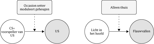 Voorbeeld: Als de persoon aangeeft dat alleen thuis zijn een voorspeller is van flauwvallen, verduidelijk dan of het het alleen thuis zijn zelf is of is dat het alleen thuis zijn de kans vergroot dat licht in het hoofd zijn leidt tot flauwvallen. Ononderbroken lijnen duiden op een directe voorspelling van CS naar US, terwijl gestippelde lijnen duiden op modulatie van de sterkte van de relatie tussen CS en US door een occasion setter.