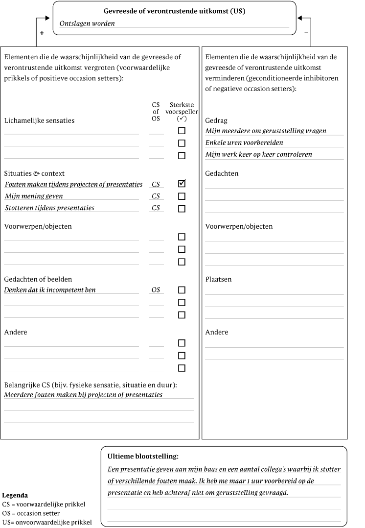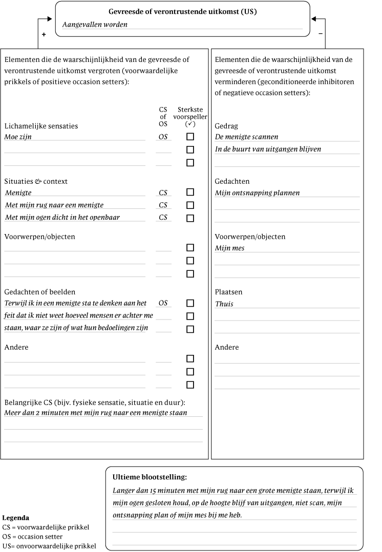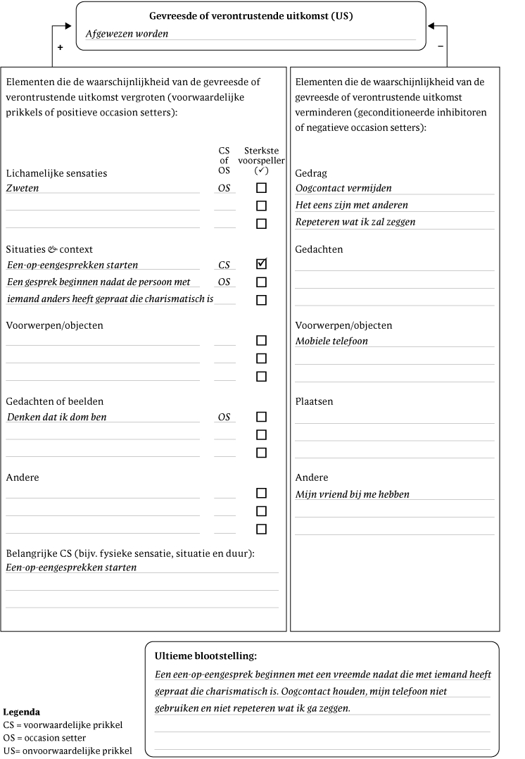 - Voorbeeld: Na het maken van de Nexus van sociale-angststoornis heb je vastgesteld dat de belangrijkste CS het beginnen van een gesprek is en dat de US afwijzing is. Vervolgens ga je naar het onderdeel fysieke gewaarwording, waar je al hebt vastgesteld dat een snelle hartslag een voorspellende stimulus is in dit domein. Vervolgens vraag je de cliënt of een snelle hartslag een onafhankelijke voorspeller is van afwijzing of dat het alleen de kans op afwijzing vergroot in aanwezigheid van de belangrijkste CS (een gesprek beginnen). Vervolgens doe je hetzelfde voor de andere stimulusdomeinen (bijvoorbeeld gedachten, objecten).