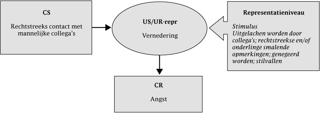 Figuur 2 Betekenisanalyse (sequentieel) met betrekking tot de angst om vernederd te worden in contact met mannelijke collega's. Voor de hand liggende interventie: exposure in vivo/gedragsexperimenten (CS niet-US/UR).