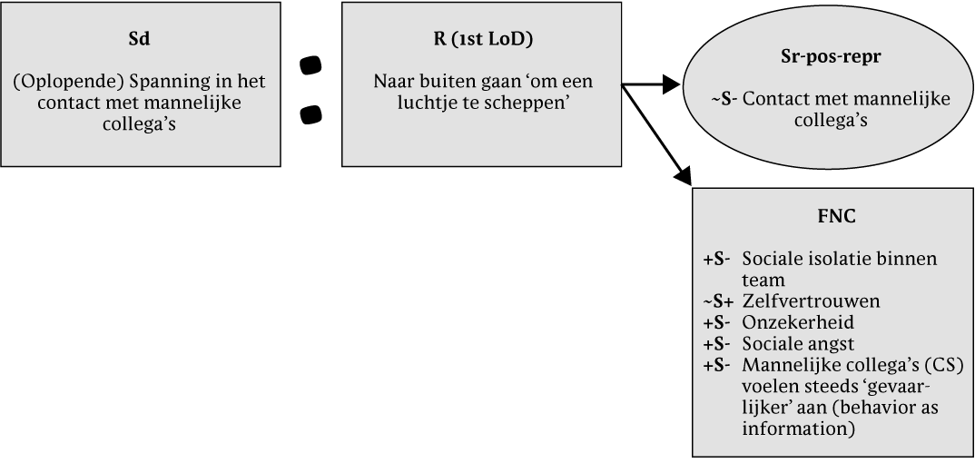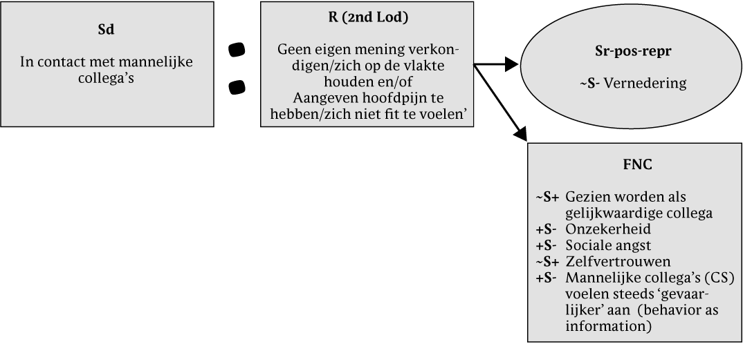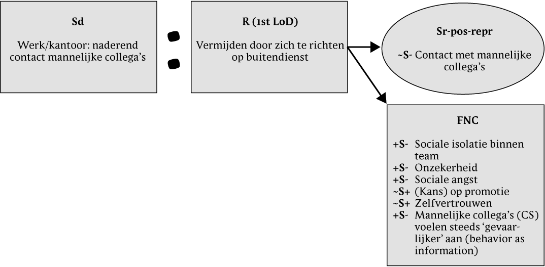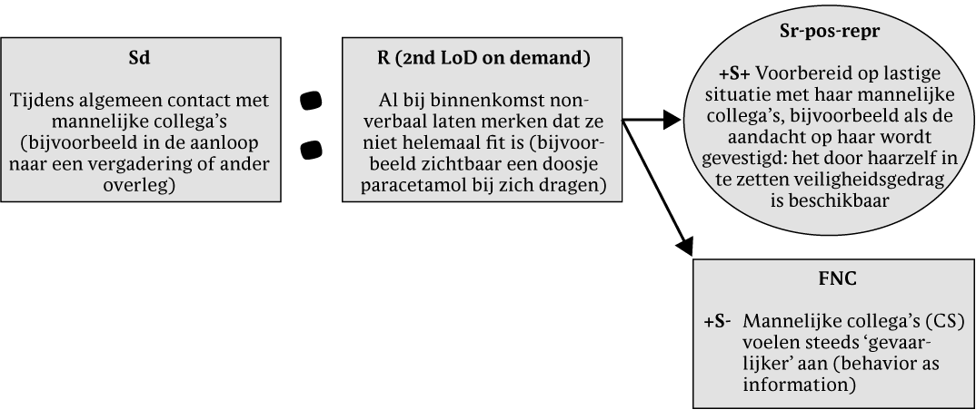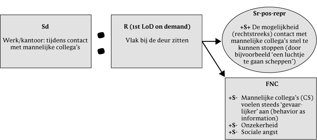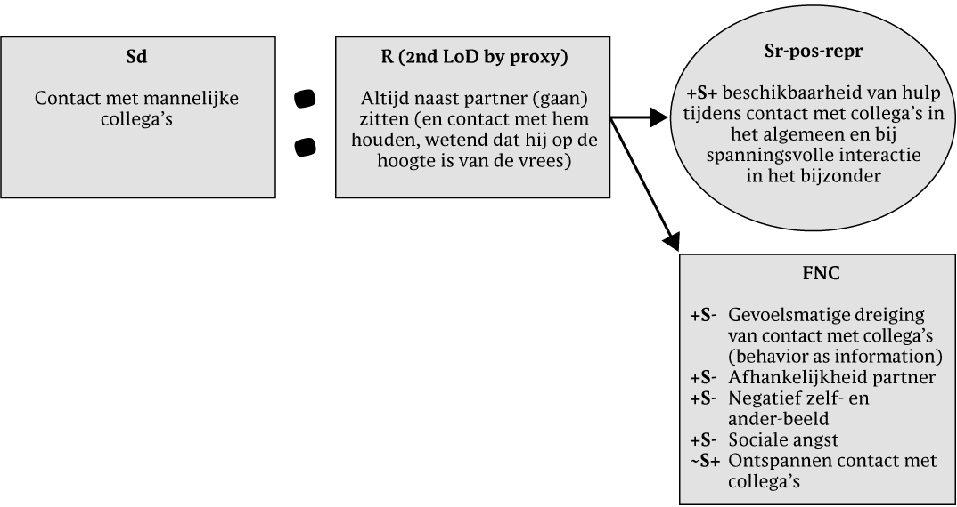 Wanneer de strategieën om de CS te vermijden niet (meer) haalbaar zijn, zal toevlucht moeten worden gezocht in veiligheidsgedrag, dat wil zeggen: gedrag dat (volgens de hier gevolgde definitie) als doel heeft het optreden van de US/UR te voorkomen, in de FA weergegeven als een ~S-. Ook Iris maakt gebruik van veiligheidsgedrag. Tijdens het onvermijdelijke contact met haar mannelijke collega's tracht Iris de gevreesde vernedering af te wenden door zich enerzijds zo min mogelijk in het gesprek te mengen en zich anderzijds – als dat niet kan worden volgehouden – zoveel mogelijk op de vlakte te houden. Ze spreekt haar mening niet uit, zeker niet als die feitelijk of vermoedelijk anders is dan de visie van haar collega's. Daarnaast geeft ze geregeld aan hoofdpijn te hebben of zich niet fit te voelen, omdat ze verwacht dat haar collega's dan mild zijn naar haar en vernedering uitblijft. De Sr-pos in de FA is het afwenden van de gevreesde vernedering (~S-) en is op zichzelf voor Iris al een volgende reden om vast te houden aan het veiligheidsgedrag (R). Voor zover het een irreële samenhang tussen R en Sr-pos betreft, kan responspreventie worden ingezet. Figuur 6 geeft de FA met betrekking tot een voorbeeld van de 2nd LoD van Iris weer.