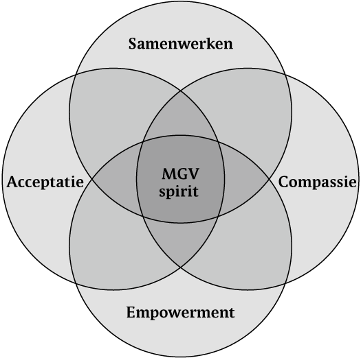 De basis van MGV is de spirit, die bestaat uit vier kernelementen, namelijk samenwerken, acceptatie, compassie en als nieuw kernelement empowerment (zie figuur 1).