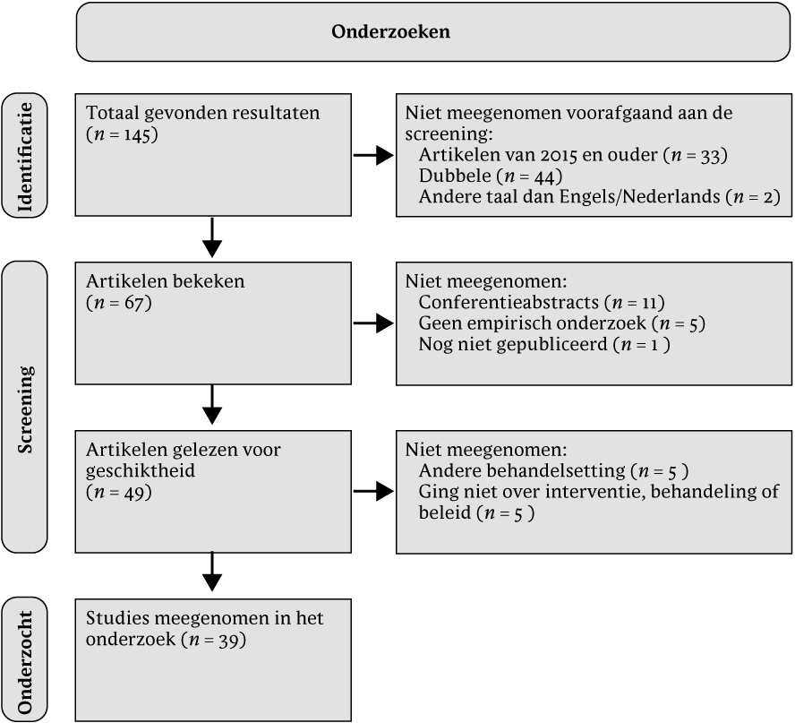 Op basis van de Engelstalige zoekstrategie werden 145 resultaten geïdentificeerd. Uit de Nederlandse zoekstrategie kwamen geen resultaten naar voren. Na screening zijn er in totaal 39 unieke en relevante artikelen geïncludeerd. Het proces van identificatie tot inclusie van de artikelen is weergegeven in een stroomdiagram (zie figuur 1).