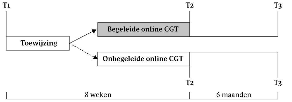 Noot. CGT = cognitieve gedragstherapie; T1 = interview voorafgaand aan de behandeling; T2 = interview direct na de behandeling; T3 = interview 6 maanden na de behandeling. De stippellijn geeft aan dat deelnemers niet actief aan de conditie werden toegewezen. De onbegeleide online-CGT-groep bestond uit alle deelnemers uit deel 1 van de studie, die in de huidige studie dienden als controlegroep.