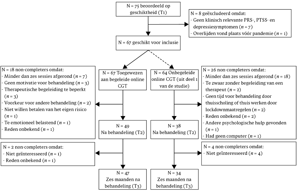 Noot. CGT = cognitieve gedragstherapie; PRS = persisterende-rouwstoornis; PTSS = posttraumatische-stressstoornis; T1 = interview voorafgaand aan de behandeling; T2 = interview direct na de behandeling; T3 = interview 6 maanden na de behandeling. De stippellijn geeft aan dat deelnemers niet actief aan de conditie werden toegewezen. De onbegeleide online-CGT-groep bestond uit alle deelnemers uit deel 1 van de studie, die in de huidige studie dienden als controlegroep.